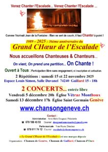 À savoir également que notre société genevoise (créée en 2015) est jumelée avec une autre Chanson, « La Chanson de Gaillard (France voisine), (www.chansongaillard.fr) initiée et dirigée également par notre chef passionné, passionnant, patient, persévérant, homme de tête (Créateur en 1989 du Grand Choeur de l’Escalade, marque officielle déposée à l’IPI Berne, qu’il a animé pendant plus de 25 ans, titulaire de la marque déposée) et dont les chanteuses/eurs participent ponctuellement à nos répétitions, et réciproquement. Nos concerts, des 2 côtés de la frontière, impliquent la dynamique présence des membres venant des deux chœurs ; le répertoire sans cesse renouvelé (original, sur mesure et varié) étant le même… Bach, Beethoven, Belafonte, Biolay, Auberson, Bühler, Bruel, Chaplin, Gréco, Eicher, Dassin, Datin, Delerm, Ferrat, Ferré, Fersen Haendel, J-Dalcroze, Ellington, Haden, Abdullah Ibrahim, Kisling, Liszt, Lapointe, Halliday, Aznavour, Chopin, Cherhal, Loizeau, James Last, Gainsbourg, Morisod, Nougaro, Pink Martini, Porter, etc…